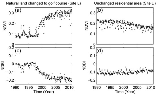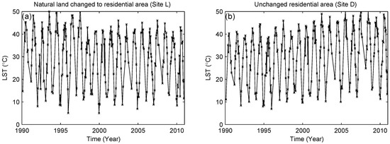 Figure 10 shows a time series plot of the land surface temperature at a sites L (a) and D (b). Comparing with the corresponding NDVI and NDBI plots of these sites (shown in Figure 2) reveals that site L temperature decreased after 1997 whereas NDVI increased. On the other hand, site D underwent a gradual increase in temperature matched by a gradual decrease in NDVI. Such trends are observed in various parts of Las Vegas showing opposing trends of LST and NDVI. An increase in the vegetation at these points is also revealed by ancillary observations from Google Earth high resolution imagery when available. Such inverse relationships between LST and NDVI are also observed by Yue et al. [57] over various land covers in Shanghai, China. In Las Vegas, this relation is consistent with the increasing trends of tree cover, open spaces, and water revealed in Figure 9. Even though the increase in vegetation is small, it shows impact in reducing the temperature. The contributing factors could include shadow on surface and role of vegetation in redirecting heat through transpiration.