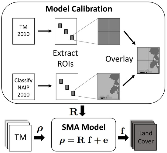The SMA method is a common approach for retrieving subpixel land cover fractions. This section provides a brief overview of this method to show its connection with the calibration technique. There is a myriad of literature describing and applying SMA to TM data, which can be consulted for more details [15,16,17,18,19,20,44,45,46].