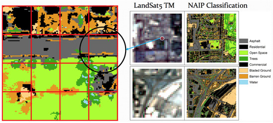 Comparison of classified NAIP image and TM image at two sites of Figure 3. A magnification of a 4 × 4 TM pixels with underlying NAIP pixels is shown on the left.