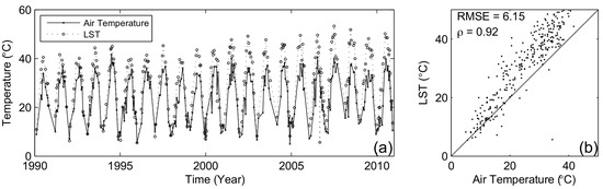 where is at-sensor brightness temperature computed from thermal band radiance () using constants and , is the central thermal band wavelength (11.45 m), is constant ( mK) from Planck’s constant, speed of light, and Boltzmann constant, and is the NDVI-based surface emissivity computed from TM bands 3 (red) and 4 (near infrared). The algorithm is described in detail in [53]. The derived LST is validated using ground-based air temperature data and shown in Figure 6. The time series comparison in this figure reveals that LST matches reasonably with air temperature until 1995 but later reveals higher summer time values. It is noted that the area around the observation point saw additional development of McCarran airport after 1995, a possible reason of change in local thermodynamics. Nevertheless, the winter values match better as also evident in the scatter plot. The overall correlation value between LST and air temperature is 0.92 with RMS error 6.15 C.