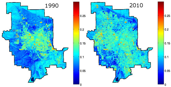 The land cover fraction of tree cover, open spaces, and water have negligible change over the study period. For example, Figure 8 compares the tree cover fraction change over the two decades. The total area of the tree canopy increased from ≈120 km in 1990 to ≈130 km in 2010 (depicted as shades of green and red). Although this increase is small but it is spatially distributed over the whole urban area. Similar to the road network, the tree canopy expansion in Las Vegas is a direct measure of the urban growth and reveals that the Las Vegas expansion is reaching its spatial limits. In Las Vegas, the expansion of the tree canopy class also reflects an increased water demand. Although the best practices of urban forestry guide that the indigenous desert plants are grown, there is some provision of water through a drip irrigation system. In 2003, Las Vegas also promoted xeriscaping practices to conserve outdoor water use. The analysis presented in this paper did not reveal any significant impact of xeriscaping. The impact is expected to reveal in the land cover fractional area of open spaces which showed negligible change.