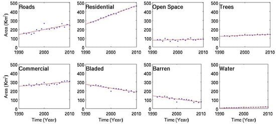 The slope of the trend lines is the rate of change of the surface area of a given class per year. Table 2 lists the rate of change of each land cover and reveals that a maximum occurred for the houses (10.5 km/year). It is followed by the asphalt (5.7 km/year) and the commercial (2.6 km/year) classes. These three classes reflect the key compositions of an urban growth. The tree cover, open spaces (grass) and water show negligible increase. Note that the open spaces represent yards and public parks, whereas water class is primarily residential pools and ponds in public parks. The classes of barren land and bladed ground decreased at a rate of 3.6 and 4.5 km/year, respectively. The bladed ground area trend was expected to mimic the variation in construction activity in Las Vegas. It may be correlated to the barren land class due to their similar spectral signatures. Nevertheless, this result can be interpreted as an overall reduction in the natural landscape which is replaced by the urban land cover classes.