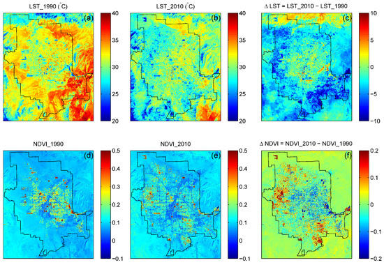 Comparison of annual averages of LST (a,b) and NDVI (d,e) during 1990 and 2010. The differences are shown in (c) for LST and (f) for NDVI.