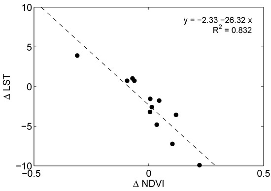 To quantify this effect, the averages of LST and NDVI over the sites A through L are computed for 1990 and 2010 and listed in Table 3. The differences are listed in columns titled LST and NDVI. Additionally, the land cover for the two years is provided to analyze the effect of land cover change. Five sites represent areas with no land cover change (A, B, C, D, and K) whereas six sites represent areas where rural land cover was changed to some form of urban land cover (F, G, H, I, J, and L) such as residential, commercial, and open space (golf course and park). One site (E) also is chosen where land cover changed from a park to residential land cover. The differences reveal that sites where rural land cover was changed to residential, park, and golf course land cover, LST is negative (decreased) and NDVI is positive (increased). Overall, LST and NDVI have opposite signs. This is further elaborated in Figure 12 as a scatter plot between LST and NDVI. A regression line is fitted with and establishes a strong relation between LST and NDVI over the selected sites. Similar phenomena have been observed in many arid cities around the world and often referred as urban cool island effect [58,59,60].