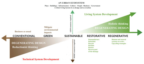 The stages of development, from conventional to regenerative, showing that regeneration goes far beyond sustainability (adapted from References [36,37]).