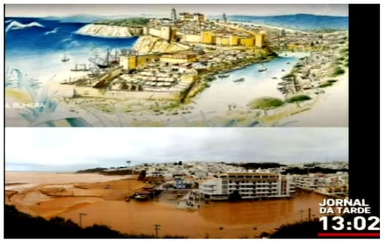 A representation of the medieval times city of Albufeira and a recent photo from the flash flood (obtained from the RTP TV channel during the news of 1 November 2015), showing that the buried river found its natural way to the Atlantic Ocean.