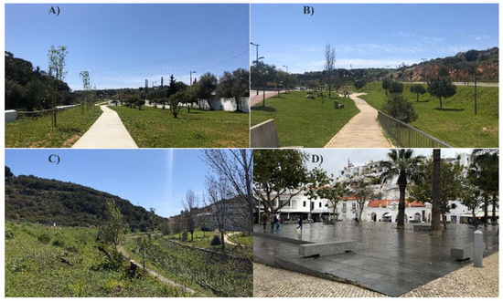 As already asserted in 1877 by John Muir, the people receive from nature far more than what they seek. Biophilic design reduces stress, improves cognitive function and creativity, improves our well-being, and provides healing for both city dwellers and visitors [13]. Adapted from Browning et al. [13], Table 2 illustrates the patterns of biophilic design and its functions in supporting stress reduction, cognitive performance, emotion, and mood enhancement as well as the human body in general. These patterns were used to provide recreation areas by walking through the new environment evolved by the restoration of the Albufeira River and the enhancement of its accompanying linear park.