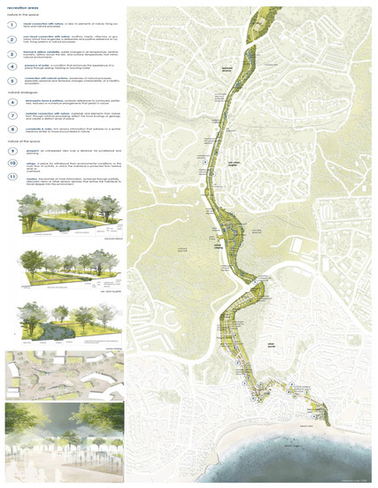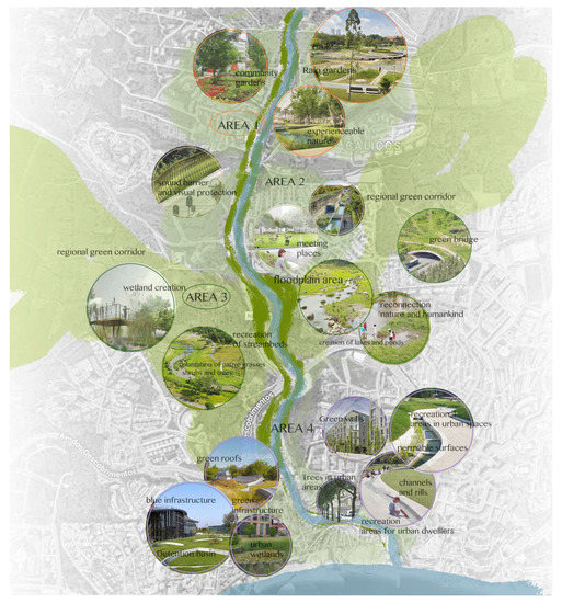 The concept of the Albufeira project for urban river recovery was inspired by nature-based solutions and biophilic design. It was inspired by previous research on biophilic design, the development of cities and their rivers as well as nature-based solutions for city resilience enhancement and the analysis of the study area using the strolling method. The river recovery was conceived as a continuous green corridor along the restored river evolving all the way down from the camping area north of Albufeira until the river mouth in the Atlantic Ocean.