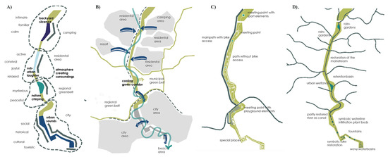 The representation of the atmosphere (A); green inking corridor (B); public spaces and path network (C); river restoration and the presence of water (D) in the four zones as defined by the strolling method.