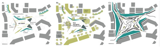 The city centre should be multifunctional and enhance resilience to climate change and its consequences. In that aspect, creating a blue and green infrastructure for the city, as illustrated in Figure 6, reducing the heat island effect as well as providing temporary storage for occurring heavy rain events was the main objective of this area, together with the entertaining and recreating functions.