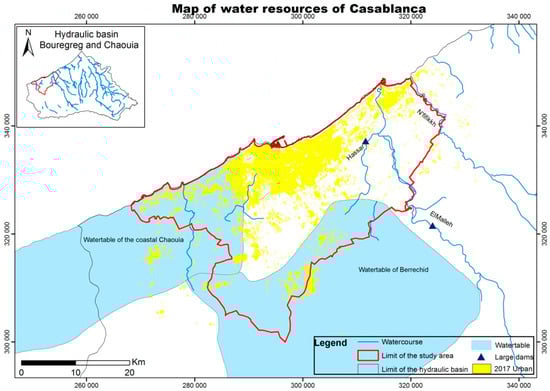 - Groundwater: The infiltrated rainwater accumulates or transits into groundwater reservoirs. The study area has two water tables and some streams, as shown in Figure 6. The first is the water table of the coastal Chaouia, which extends over 1.200 km² of the coastal strip and is 20 km wide. It is characterized by very low piezometric levels, varying between 8 and 20 m, medium to low permeability over its entire extent, and flows per structure generally not exceeding 4 L/s. It has a potential of 52 million m3 [44]. Of a heterogeneous nature, it is contained at once in the calcareous formations of the plio-quaternary, in the Cenomanian marnocalcaries, and in the primary schistose, sandstone, and quartzitic terrains [52].
