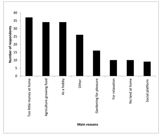 The three most common reasons provided by the respondents for participating in urban community food gardening were because there was “too little money at home” to purchase either sufficient or preferred food (54%), followed by “as a hobby” and “to grow food” (each 49%) (Figure 2). The more social reasons were mentioned by fewer respondents. The ‘other’ category included reasons such as helping the community with food donations, food donations to funerals, trying to involve the youth in useful activities, and food security.