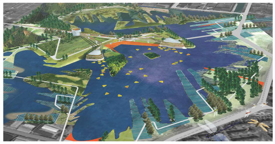 Landscape architects explored a different approach in urban form, an approach known as “Landscape First” (as opposed to architecture/circulation first (Figure 4) [1]. In architecture/circulation first, streets are organized, then buildings are placed in the spaces between the building, and green space is then set around a structure as an ornamental feature. In landscape first, the needs of the environment are initially considered—similar in thinking to McHarg in 1969 and Lewis in 1996, so the idea is not necessarily new [44,60]. Circulation is composed to accommodate the needs of the environment. Finally, structures are placed in this setting. It is a very different way of thinking about design and form. Many landscape architects are trained to think this way, and this kind of thinking is illustrated in the works of James Hawks Jr. [61]. In land development, James Hawks Jr. would be the first to explore its possibilities for a client, organizing the landscape to perform ecological services, develop a circulation pattern, and then placing potential structures. Architects and engineers would be involved in the project, but Jim was involved from the start to the end of the project. Dr. Binyi Liu, a professor at Tongji University in Shanghai, has been influential in designing a truly landscape-first project, Jiyang Eco-Park, and has lectured on the subject [1]. Sometimes, this approach has been affiliated with post-postmodernism and landscape urbanism.
