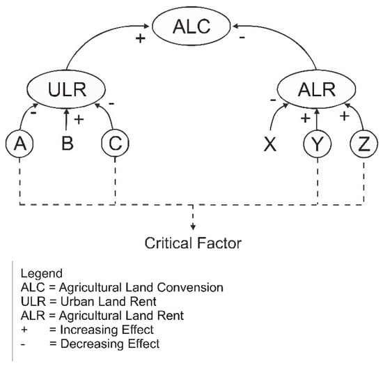 Based on traditional location theory, the conversion of agricultural land is caused by the relatively higher rent that is created from urban land use, compared to agricultural land use [22,23,24]. ALC in developing countries is rapid and mostly unplanned. As most urban area is surrounded by productive agricultural land [25], uncontrolled ALC directly diminishes food production and the provision of ecosystem goods and services derived from these land types [26]. Thus, it is important to control ALC. To achieve this goal, it is crucial to look at the root cause of ALC in the first place. As previously mentioned, the major cause of ALC is the differing rent that is created from urban and agricultural land use. The higher rent of urban land use will promote further ALC. Conversely, the increasing rent of agricultural land will limit ALC. Actually, land rent for urban and agricultural uses are affected by many factors. Hence, ALC can be controlled by focusing on important factors that increase agricultural rent and that decrease nonagricultural (urban) rent. Diagrammatically, this argument is provided in Figure 1.