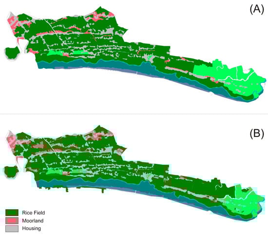 Map of Kepanjen Village. (A) Land use distribution in 2012. (B) Land use distribution in 2017, showing a relatively constant trend of agricultural land and housing.