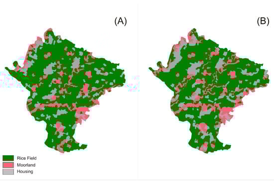 Map of Antirogo Village. (A) Land use distribution in 2012. (B) Land use distribution in 2017, showing a growing land area for housing.