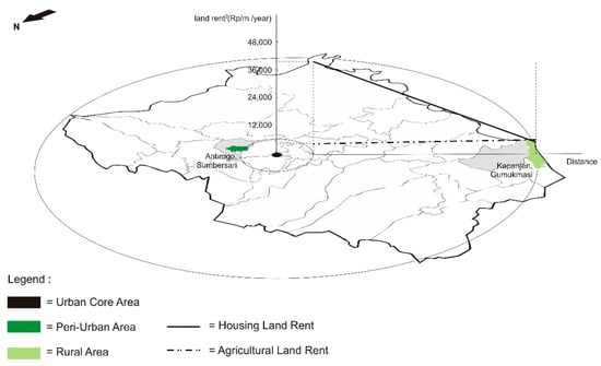 Land rent analysis revealed that the peri-urban area has a lower value for agriculture, but a higher value for housing (Table 3). The average agricultural land value in the peri-urban area is Rp 4447/m2/year, ranging between Rp −416/m2/year and Rp 10,975/m2/year. Meanwhile, in the rural area, it averaged Rp 6047/m2/year, ranging between Rp 1600/m2/year and Rp 19,504/m2/year. Conversely, the average housing land value in the peri-urban area is Rp 39,904/m2/year, with a wide range between Rp 7917/m2/year and Rp 142,188/m2/year, and this is seven times higher on average, compared to the conditions in the rural area. In the rural area, the housing value was only Rp 5059/m2/year on average, ranging between Rp 278/m2/year and Rp 14,908/m2/year. There is a negative value in peri-urban agriculture, meaning that there are farmers who choose to remain in farmland, even at the expense of farming profits. At the same time, peri-urban housing yielded a value that was seven times higher, but the converse did not apply in the rural district, where agricultural land yielded a value that was only 19% higher.
