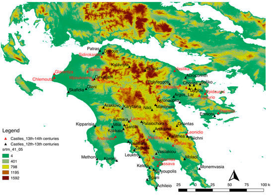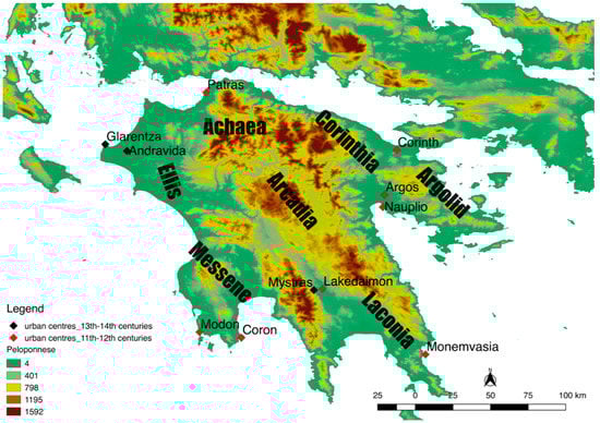 The Peloponnese was a province of the Byzantine Empire in the 11th and 12th centuries and, after 1204, was divided into three distinct political entities: the Frankish Principality of Achaea with Andravida as its capital, the Venetian Colonies of Modon and Coron, and the Byzantine lands in the southeast. The literary sources, from the period in question, use many terms to characterize a city. For example, Nicetas Choniates uses a variety of words in his Χρονική Διήγησις: πόλις (city), πόλισμα, πολισμάτιον, πολίχνιον, πολίχνη (township), μεγαλόπολις (large city/mega-city/megalopolis), μητρόπολις (metropolis), καλλίπολις (beautiful and ornamented city), ἄστυ (town), φρούριον (fort), ὀχύρωμα (fortress), and κάστρον (castle). Thus, according to Choniates, a settlement is defined as urban, in the period in question, by its large size and dense population (megalopolis), its ornamentation and monumental buildings (kallipollis), its episcopal see (metropolis), and its circuit wall (fort, fortress, and castle) which served as protection for its inhabitants [11]. There are four identified metropoles in the Peloponnese from the late 11th century until 1204: the metropolis of Corinth, Patras, Lakedaimon and Argos [18] (pp. 138–158) which, according to Choniates, would make them the largest urban centers at the time. Moreover, the Arab geographer Al Idrisi, in 1154, mentions sixteen important cities in the Peloponnese, and the ones that have been identified are Corinth, Patras, Argos, Nauplio, Lakedaimon, Monemvasia, Modon, and Coron [19] (pp. 121–132).