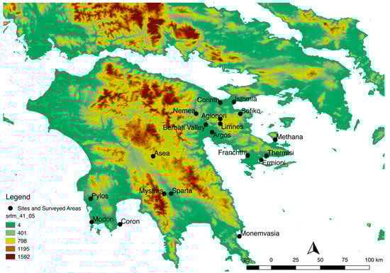 The Peloponnese is a typical Mediterranean landscape, with mountains often dropping into the sea resulting in a deep coastline; among these mountains, there are either small or large valleys [7] (p. 32). The Peloponnese is located in the southern part of modern Greece; to its west is the Ionian Sea, and to its east the Aegean. According to Campbell [8] (pp. 332–355), the climate conditions have not seen drastic deviations from the Medieval period to the modern times, though there were some periods with low temperatures and extreme weather events. Thus, in the Peloponnese, the climate must have been characteristically Mediterranean with a warm and dry summer from June to August, and a moist period during the autumn, winter, and spring, along with some cold and drought events within the year.