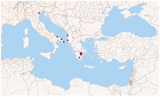 The significance of the secondary production in the Peloponnese, and the quality of their manufactured products in the 11th and 12th centuries, is attested through the ceramics and silk textiles. The Measles ware is considered to be a Peloponnesian production from a workshop at Corinth and/or Sparta [81] (p. 267). White, with her analytical work, has testified that the Measles wares found at Corinth are locally produced [82] (p. 109). This ware has been recorded in the Peloponnese, Italy, and Albania ([81] (p. 267) (Figure 4). Furthermore, the presence, permanent or not, of Venetian merchants, who were exporting silk textiles in the ports of Corinth and Sparta, has been testified since 1088 [83] (pp. 379–380).