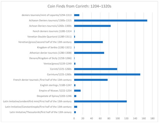 There are coin reports only from two of the port towns of the Peloponnese, Corinth (Figure 5), and Glarentza (Figure 6), which prove the importance of these ports in the international trade networks. According to Penna [93] (p. 212), from Corinth, more than 6000 coins have been published dating this period, as well as fourteen hoards; five of them date from the reign of Alexios I (1081–1118), one from the reign of John II (1118–1143), and five from the reign of Manuel I (1143–1180). Interestingly, three of the hoards had coins coming from non-Byzantine territories: one had 119 coins of the Bishops of Clermont, one of the Bishops du Puy, and one gold coin of Alexius I [93] (p. 212), [94] (p. 11); another hoard was found in the east parodos of the Roman theatre, and had six follis and sixty-five bronze Seljuq coins [93] (p. 212); the third hoard included nine coins from Valence, and five from Lucca [93] (p. 212), [95] (pp. 99–100). Since the Byzantine authorities allowed only the use of Byzantine issues, the concealment of these hoards does not necessarily indicate transactions with a foreign currency at Corinth. Most likely, these hoards belonged to travelers who stored their savings in times of danger [93] (p. 212). Nonetheless, the existence of these foreigner hoards affirms the international position of the city of Corinth, and its connection through maritime and trade routes with the west, the Crusader states on the Syro-Palestinian coast, and the Islamic East. From the early 13th century, the coins found at Corinth come from the West, such as English sterlings, French deniers tournois, and coins from the Kingdom of Naples, dating to the first half of the 13th century (Figure 5). From Glarentza, there are no records for French deniers tournois, and the majority of the coins were cut in its own mint [66] (pp. 271–277) (Figure 6). Venetian coinage has a strong presence in Corinth and Glarentza from the mid-14th century (Figure 5 and Figure 6), a period when the mint in Glarentza had closed, and the markets of the Peloponnese were consuming Italian ceramics [96] (pp. 170–171). It is possible that the large amounts of Venetian coinage met the need for cash during this period, resulting from the lack of coins created by closing the mint in Glarentza.