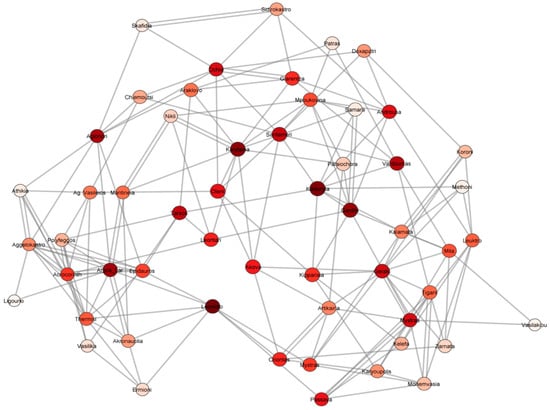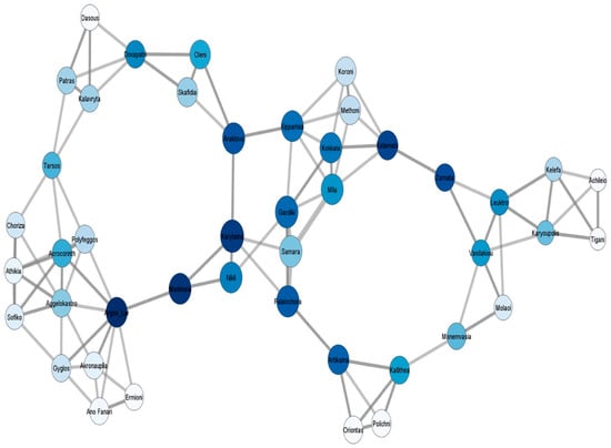 Closeness and betweenness centrality are the concepts of network theory that are applied in the created models. On the one hand, closeness centrality underlines the importance of the distance in a network, since the closeness of a node is the distance of the node to all the other nodes in the network, indicating that nodes with high closeness can get to all the other nodes of the network quicker than nodes with low closeness [98] (pp. 61–62). On the other hand, betweenness centrality highlights the number of times a node acts as bridge on the shortest path between two other nodes. Therefore, nodes with high betweenness imply their significance regarding their connection between other nodes, and their role as congestion points in the network [99] (pp. 129–130). The betweenness centrality of a node is measured by color: the bluer the node (Figure 8), the greater the betweenness centrality; the redder the node (Figure 9), the greater the betweenness centrality, while the closeness of a node is measured by size—the larger the node, the greater the closeness centrality. The models that have been created are undirected, since the links between the nodes cannot be identified. Moreover, these models are simply a mere perspective of the reality and do not depict the actual connections between the various castles, since they have been stimulated by a hypothetical scenario. However, they visualize possible interactions between the castles and the regions of the Peloponnese, and how these might change over time in the face of shifting settlement patterns.