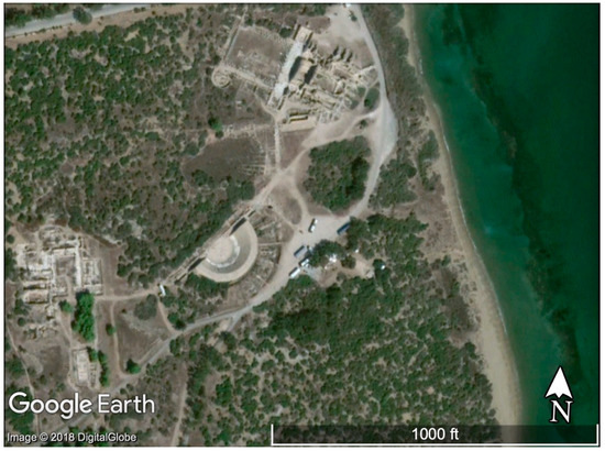 Aerial view of the modern ruins of Roman Salamis showing the location of the theater, gymnasium, and baths. Note the reefs visible in the sea to the east. Source: Google Earth; Map Data: Google, Digital Globe.