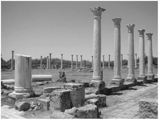 Its economic and administrative functions are in evidence based on epigraphy and archaeology. Salamis’ epigraphic record [59] (p. 240) sheds light on the massive wealth and political power that could be accrued by native Cypriots as the region’s agricultural goods were prepared for export from the city’s massive agora by workers, such as members of the flax-weavers guild [44] (p. 122). For example, extant dedicatory inscriptions illustrate that during the Flavian era (60s–90s AD), the Salaminian and Roman citizen, Sergius Sulpicius Pancles Veranianus, was able to be the high priest of Cyprus three times, the ambassador to the emperor three times, the builder of the theater and bath house, and the donor of imported marble statues to the amphitheater [60] (p. 119). He also no doubt spent time in the city’s lavish gymnasium’s palaestra, which today sports a striking colonnade made of costly imported marble (Figure 7). John Leonard [34] (p. 810) assumes that Pancles made his fortune, at least partly, via the maritime trade derived from Salamis’ central location.