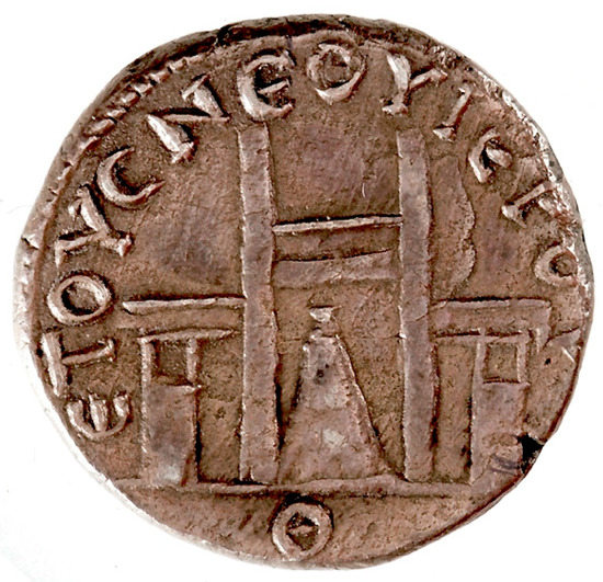 Reverse image of the Temple of Aphrodite at Palaipaphos on a silver tetradrachm minted under the authority of the emperor Vespasian for Cyprus (77–78 AD). Image courtesy of the American Numismatic Society.