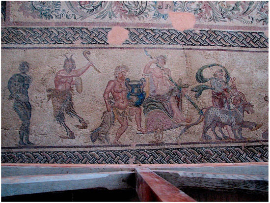 The cultural effects of Nea Paphos’ centrality were perhaps best witnessed in the elaborately decorated villas of Early Roman date that were discovered to the south of the city’s agora [27] (pp. 226–235). Excavations have revealed a series of large Roman atrium houses of second and third century AD date, which are decorated with elaborate mosaic floors that indicate cultural dialogues with wider Greco-Roman culture [75] (p. 5). In the so-called “House of Dionysos,” depictions of the Greek myths of the Triumph of Dionysos (Figure 11), Piramus and Thisbe, and Ganymede rival mosaics found throughout the Roman east [76], while images of the seasons or hunting seem similar to topics found in North Africa.