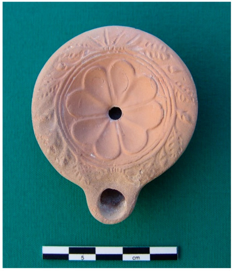- Gordon, J.M.; Cova, E. Romanesis in Cyprus: A Lamp from Athienou-Malloura. Cah. Centre d’Études Chypr. 2010, 40, 277–294. [Google Scholar]