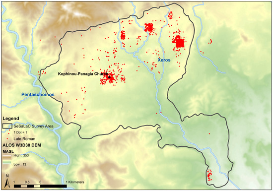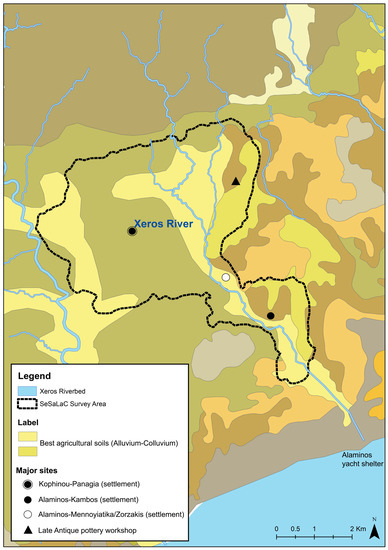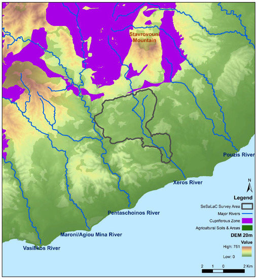 Surface material evidence of ancient rural activities in our region includes contemporary agricultural terraces, impenetrable hilly areas, and visible archaeological features, but this activity is represented mainly by poorly preserved pottery. Thus, the identification and the subsequent distinction amongst different types of rural settlement pose challenges for the regional survey [1,2,3]. We very much base our research on the spatial analysis of settlements that emphasise location in association with natural resources (mainly soil and land types, copper mines, and water availability). In these attempts, Geographic Information Systems (GIS) have proved to be very useful, and their employment has assisted us in contextualising rural sites within their habitation and economic frameworks, maintaining in mind, at the same time, the problems around their deterministic nature (cf. [4] (p. 552, with references) [5] (pp. 149–150).