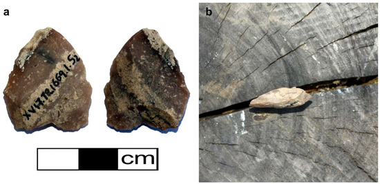 Lithics currently under study: (a) Arrowhead on both sides; (b) arrowhead side-view on tree-trunk stump (Images by Charalambos Paraskeva).