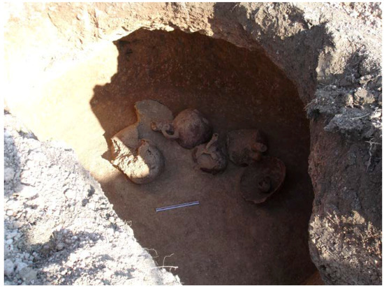 The Department of Antiquities of the Republic of Cyprus had previously undertaken the excavation of trenches at the site of Alaminos-Kambos unearthing stratified pottery of the Early (ca. 2250/2200–2000/1950 BC) and Middle (ca. 2000/1950–1680/1650 BC) Bronze Age, some walls, and floor installations [22] (pp. 90–91), (cf. [23] (pp. 445–446)). In addition, following an accidental discovery, the Department of Antiquities excavated an intact Early Bronze Age tomb south of the settlement, where a skeleton and 7 well-preserved Red Polished Ware vessels were recovered (Figure 7). Our systematic survey in the Xeros River valley has identified Early and Middle Bronze Age evidence for intensive settlement activity south and east of the medieval tower of Alaminos at this site (Figure 8). The dense concentration of pottery, accounting for more than 700 sampled potsherds (Figure 5) dated to the period (and many more counted in the survey transects of the site), together with other artefacts, such as millstones and grinding tools (Figure 9), suggests the presence of an enormous settlement. The maximum spread of material is ca. 70 ha, but it is not yet clear as to whether the concentration represents a site, multiple clusters of a site, moving households within the site at different phases of the long Early-Middle Bronze Age, or a central site with satellite cemeteries (for problems in site estimates in Late Bronze Age Cyprus however, see [24] (esp. pp. 13–16)). The possibility of initiating a geophysical prospection at Alaminos-Kambos may help us further clarify the situation. Moreover, we identified a small group of looted tombs along one of the streams of the Xeros River, on the easternmost edge of the site. In accordance with other Cypriot Early and Middle Bronze Age sites, cemeteries of the period seem to be located outside the settlement, usually on nearby hillsides.