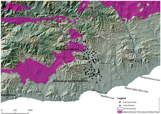 - Georgiadou, A. The Vasilikos valley within the Amathusian territory in the Iron Age: Settlement patterns and inequalities. In Structures of Inequality on Bronze Age Cyprus. Studies in Honour of Alison K.South; Studies in Mediterranean Archaeology 187; Hulin, L., Crewe, L., Webb, J., Eds.; Paul Åströms Förlag: Uppsala, Sweden, 2018; pp. 155–167. ISBN 978-9925-7455-0-0. [Google Scholar]