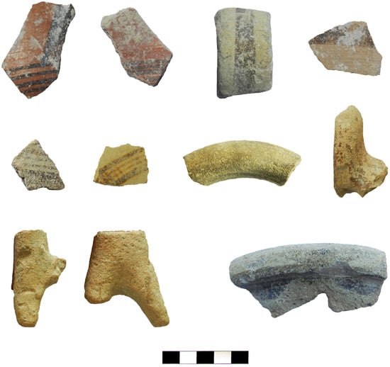 As already mentioned above, the Xeros River valley is clearly located in a frontier zone between the polities of Amathous, Idalion, and Kition. Current trends in social anthropology and archaeology do not foster models that present human societies as stiff, static, and mechanistic; through the concept of materiality they refer to the ongoing dynamics of human and thing relations, avoiding conclusions about the history of a region or people by applying spatial distribution and culture-historical approaches of different territorially fixed cultures [65]. SeSaLaC explores alternatives to culture-historical approaches in an attempt to shift the focus from object-centre to actor-centred perspectives. We acknowledge that analytical networks are often traced on the basis of a shared material culture (same pottery shapes, styles, clays or raw materials), but this is not an unproblematic method. A preliminary study of the Cypro-Archaic and Cypro-Classical surface ceramics has demonstrated that about 95% of the sampled material is made of fabrics, shapes, and styles that are similar to the pottery found at the very centre of Amathous (personal communication with A. Georgiadou, Iron Age pottery specialist, who undertook a preliminary study of the material, 23 September 2018). Most of the recovered pottery demonstrates the stylistic and technical attributes of the Amathousian style; in general, the Amathousian clay products, either terracotta figurines or pottery, display the same fabrics characterised by the presence of numerous tiny black inclusions of coastal sand from the (present-day) Limassol district [46] (pp. 95–96, with references).