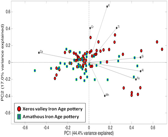 The pXRF and statistical analysis comparing the Xeros River valley Iron Age pottery with pottery from the palace of Amathous (Principal Component Analysis by Andreas Charalambous).