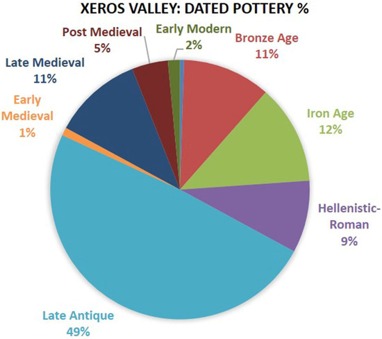 By the middle fourth century AD, the social transformations taking place throughout the Eastern Mediterranean led to gradual changes in the urban centres and in the countryside. Settlements and new cult sites dating to the fifth century AD, like the basilicas at Karpasia, Lapithos, Tremithous, and Yialousa, document both the expansion of rural settlements and the successful Christianisation of the countryside [76]. At the very centre of our research area, excavations revealed the foundations of a three-aisled basilica of the sixth or early seventh century AD, upon the central aisle of which the eleventh-century AD church of Panagia was erected. The distribution of Late Antique pottery at the site gives the impression of a thriving rural establishment of some 13 ha in size (Figure 22). Overall, Late Antiquity (ca. 330–650 AD) occupies the greater percentage of the total dated pottery (to this moment) in the Xeros valley assemblage (Figure 23).