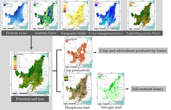 A brief description of input data and the soil erosion model (RUSLE) and its biophysical and anthropic parameters are given below. Next, we present the agricultural productivity and nutrient loss methodologies that were used to quantify the impacts of water soil erosion in agricultural lands. Other forms of erosion (harvest erosion, gully erosion, wind erosion, etc.) are not considered here. Finally, we present the statistical analyses applied to analyze the main parameters contributing to erosion in different areas of the Cerrado, such as erosivity, erodibility, topography, cover management, and supporting practices.