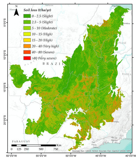 Map of potential soil loss rate (t ha−1 yr−1) in the Brazilian Cerrado (reference year: 2012).