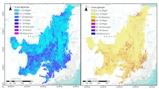 where N and P are the estimates of nitrogen (kg ha−1) and phosphorus (g ha−1), respectively, in the soil erosion, A is the soil erosion rate (t ha−1 yr−1), and TOTN and TOTP are soil total nitrogen (in kilograms of N) and total phosphorus (grams of P) per kilogram of soil, respectively. We are aware that connecting nutrients and crop productivity is a complex task given that crop productivity depends on several factors, such as plant genotype, pest control, available water, association with microorganisms, agricultural management, and many others. Therefore, here we estimated nitrogen and phosphorus potential loss as just one of the factors that can affect agricultural productivity.