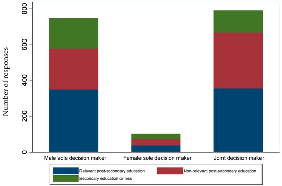 Among female sole decision makers, 32.0% have secondary schooling or less, 30.1% have post-secondary education in a non-relevant field, and 37.9% have post-secondary education in a relevant field. Just under 40% of male sole decision makers have secondary schooling or less, while 45.0% have post-secondary education in a relevant field. The share of male decision makers with non-relevant post-secondary education is substantially less than that of their female counterparts at 15.7%. Among joint decision makers, one or both partners have relevant post-secondary education in 46.8% of cases and non-relevant post-secondary education in 22.7% of cases.