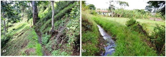 (a) a traditional water furrow (mfongo) cutting across a hillside on Mount Kilimanjaro; (b) a water furrow leading up to a Chagga home garden (photos published by Sunday [] and reproduced with his permission @ Sabbath Sunday).