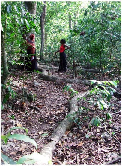 Sacred areas are also common in West Africa. In Benin, 2940 sacred areas have been documented ranging in size from 0.1 ha to 1600 ha, covering a total of 18,360 ha [,]. Apart from being heritage places, these areas are highly important as biological refugia and function as seed-banks and genetic reservoirs []. In numerous regions of Benin, sacred areas can exhibit higher tree species diversity than state-established conservation spaces []. Estimates in Ghana suggest there are 2000–3200 such sacred sites []. Studies within sacred groves on the Accra Plains found that the biomass and diversity of small mammals often exceed that of surrounding biomes []; similar correlations have also been made more recently regarding butterfly populations []. In the Loma area in Liberia, dominated by the Upper Guinea forests, sacred areas are often the sites of old towns or graves and the long history and mobility of people and settlements has created a dense network of such sacred areas []. Socially proscribed systems of protection surrounding sacred areas allow for the maturation of old growth trees. At the same time, economically important shade-tolerant tree crops (e.g., Kola, cocoa and coffee) can be planted amongst the trees, thriving in the nutrient-dense soils that often result from anthropogenic inputs associated with settlements, such as charcoal, animal dung and food refuse. A comparison between the sacred areas and unmanaged fallow areas shows that vegetation in sacred areas is more heterogeneous in the basal layers and higher in the upper layers of the canopy [].
