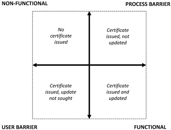 In order to assess if the processes of updating the land certificates within the land certification system are functional, we have adopted an exploratory evaluation approach. Methodologically, this involves taking an inductive research approach, whereby an initial observation is followed by the exploration of patters and the presentation of potential hypotheses. Before conducting this study, the authors had anecdotal experiences regarding land certificates not being updated, but were unaware of any studies exploring this question specifically. In addition, there have been suggestions that research on this topic be undertaken [8], as far as we know this is one of the first efforts to do so. As a first step, in a potential series of research processes, we felt it useful to conduct an exploratory study, which would guide more specific research questions, metrics and analyses of broader studies that may follow. To do this, we sought to understand the status of certification using a heuristic to categorize trends (Figure 1) in each kebele, while drawing upon qualitative data to explain how these respective outcomes have emerged. For land certification, we consider a functional system one wherein certificates are being issued and updated and a non-functional system where systems are not being issued at all. Variants of non-functionality include process barriers, such as certificates being issued but not updated over time (e.g., an institutional or administrative process), as well as user barriers, such as certificates being issued but updates are not sought by the users (e.g., knowledge, attitude or behavioral). These two components of non-functionality provide insight into the barriers of sustainability. This study has highlighted process barriers and functionality, while studies in other countries, which are discussed below, highlight user barriers.