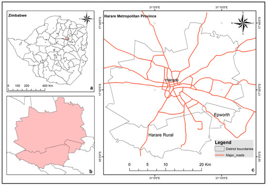 Location of the Harare Metropolitan Province composed of the Harare urban, Harare rural, and Epworth districts. (a) Zimbabwe district boundaries highlighting the study area; (b) Harare Metropolitan Province study boundaries; (c) major roads marked in the Harare Metropolitan Province map indicating the major urbanisation axis.