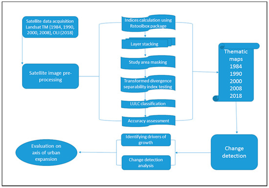 Cloud-free Landsat satellite images of 30 m × 30 m resolution were acquired from the United States Global Survey (USGS; www.earthexplorer.usgs.gov). These Landsat satellite images were selected because of their adequacy and availability for LULC classification, as indicated by multiple studies (among others, [16,38]). Landsat 5 Thematic Mapper images were selected for the years 1984, 1990, 2000, 2008 and Landsat 8-OLI image for the year 2018 (Table 1).