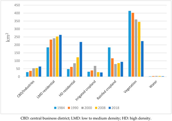 The data revealed an increase in the high-density residential areas and, consequently, a decrease in the area covered by vegetation all over the Harare Metropolitan Province (Figure 3, Figure 4, Table 3). In the year 1984, high-density residential areas covered 51.79 km2 (5.81%) of the total Harare Metropolitan Province, while, by the year 2018, it had more than quadrupled reaching 218.35 km2 covering almost a quarter of the Harare Metropolitan Province area. The data also showed a steady increase in central business department (CBD) or industrial areas from 3.7% in 1984 to 7.17% in 2018. In addition, coverage by low- to medium-density suburb areas steadily increased, covering 21.85% of the Harare Metropolitan Province in 1984 to 29.48% in 2018. Apparently, in 1984, vegetation covered almost half of the area (448.67 km2) of the total Harare Metropolitan Province but decreased by nearly 50% to 223.45 km2 (25.08%) by the year 2018 (Figure 3, Figure 4, Table 3).
