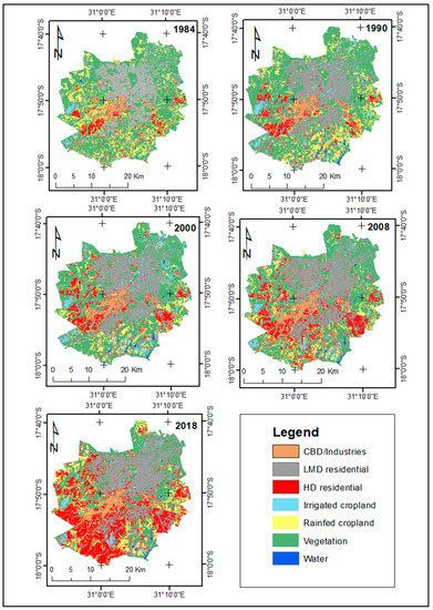 The spread of croplands (combined irrigated and rain-fed croplands) decreased from a coverage of 17.89% of the Harare Metropolitan Province in 1984 to 13.40% in 2018. The areas covered by water slightly increased from about 0.40% in 1984 to 0.53% in 2000; however, this coverage declined sharply to 0.31% in 2018. Between 1984 and 1990, high-density residential areas were spreading towards the west and northwest of the city (Figure 4). Yet, between 1990 and 2018, a spread of urbanized areas can be seen towards the south, southwest, and southeast of the Harare Metropolitan Province (Figure 4). In addition, low- to medium-density suburbs expanded towards the northeast of the Harare Metropolitan Province, increasing from 21.85% in 1984 to almost 30% of the area in 2018 (Figure 4; Table 3).