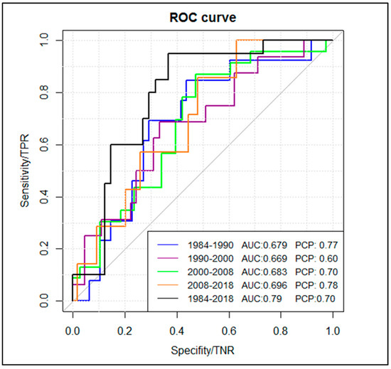 Receiver–operating–characteristic (ROC) curves conveying binomial logistic regression analyses results for urban growth from 1984 to 2018 within the Harare Metropolitan Province (TPRs: true positive rates; TNRs: true negative rates; AUC: area under the curve; PCPs: percentage of correct predictions).